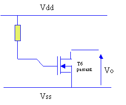 La tension Vi est < 1,5 V alors T2 est bloqué et T4 est passant. Donc VGS de T6 = 0 V ce qui implique que T6 est bloqué. Par contre, le transistor T5 est passant.