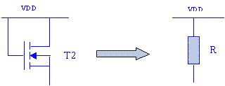 Voici le schéma d'étude de la porte inverseuse NMOS. Nous avons remplacé les transistors T1 et T3 par des résistances.