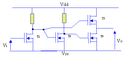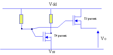 La tension Vi est > à 1,5 V alors T2 est passant et VGS de T4 = 0V ce qui entraîne T4 bloqué. Donc, T5 est bloqué et T6 est passant.